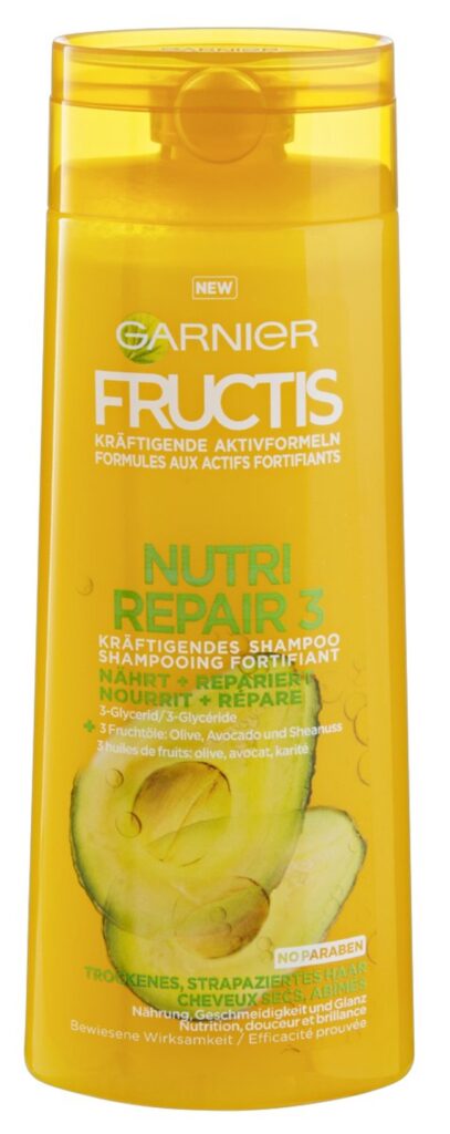 Les nouvelles formules Fructis sans paraben au concentré d’actifs fortifiants de fruits. Une combinaison exclusive à l’efficacité prouvée d’extraits dérivés de fruits et de plantes, de vitamines B3 et B6 et de protéine de citron*. Pour des cheveux plus sains, plus forts. Fructis associe dans sa formule le pouvoir nutritif de 3 huiles de olive, avocat et karité à celui de la 3-glycéride, un actif connu pour ses propriétés nourrissantes, pour apporter réparation et douceur au cheveu. Résultat: des cheveux nourris, plus soyeux et plus brillants.Renseignements pratiquesNos formules offrent efficacité, plaisir d’utilisation et respect. Elles sont adaptées à un usage quotidien. En cas de contact avec les yeux, les rincer immédiatement.