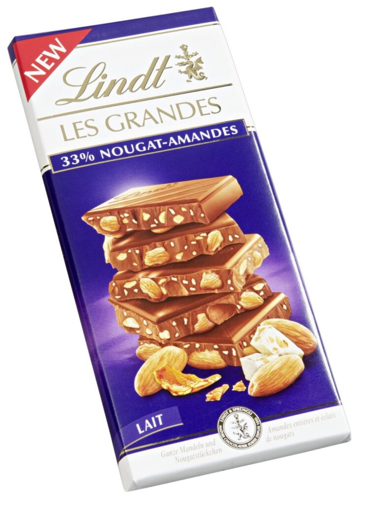 Chocolat 33% Nougat-Amandes Lindt en Plaque de 3 X 150 gr