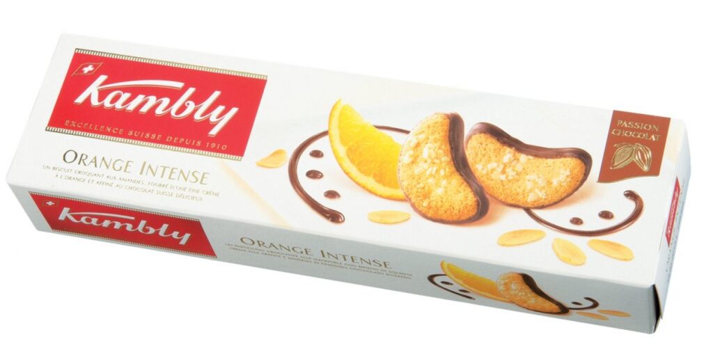 Chocolat 29% (sucre, pâte de cacao, beurre de cacao, LAIT entier en poudre, BEURRE concentré, émulsifiant [lécithines de SOJA], vanille. Cacao: 47% min.), sucre, graisses végétales (palme, palmiste, coco), AMANDES 10%, farine de BLE, LAIT écrémé en poudre, féculede pomme de terre, huile de tournesol, concentré de jus d’orange 1%, blanc d’OEUF en poudre, sucre caramelisé, émulsifiant (lécithines de SOJA), maltodextrine, oranges en poudre, sirop de glucose, sel, BEURRE, huile essentielle d’orange, LAIT entier en poudre, miel de pâtisserie. Peut contenir des traces de NOISETTES et PISTACHES.